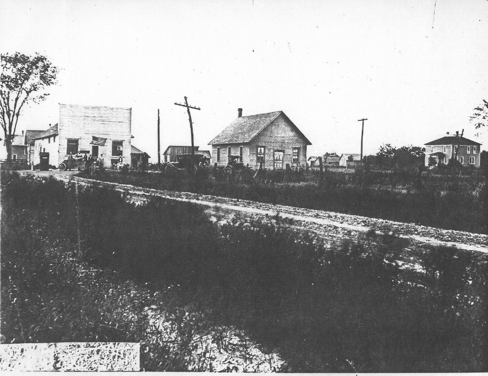 Present area of the Gotts Settlement ( Note: Township Hall ) Owing to a mistake in locating the lands by the parties who helped me, found the next spring that I had chopped on the wrong land all winter. Had to begin all over again. For many years there were no bridges across the Pigeon river, so often in the winter time had to break the ice where it was not frozen hard enough to bear the weight of a man and wade or pole a raft across with the necessary supplies. As soon as I had a clearing large enough to raise grain I bought two and one-half bushels of spring wheat for $3.00 per bushel. Had to carry it on my back for four miles, then plant it with a hoe. The next year sowed 12 bushels of oats, which I also carried in, bringing two bushels at a time. Generally the implements the pioneer had were an axe, hoe, handspike, shovel and a grindstone, until the fires of '71 and '81 let in the sunshine and the wind. This made it possible to burn the timber more easily.